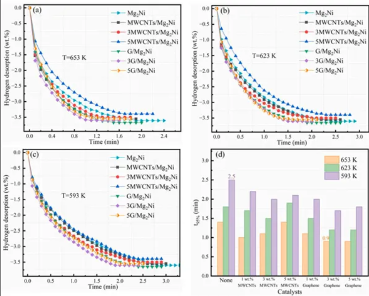 MWCNTs和石墨烯的結合有效地降低了Mg2Ni合金放氫反應所需的活化能,從而提高了放氫動力學效率。特別值得注意的是,在3wt%石墨烯復合材料中,激活能最低為58.7kJ/mol,與Mg2Ni合金相比降低了約10kJ/mol。這突出了合金放氫動力學最有效的增強。